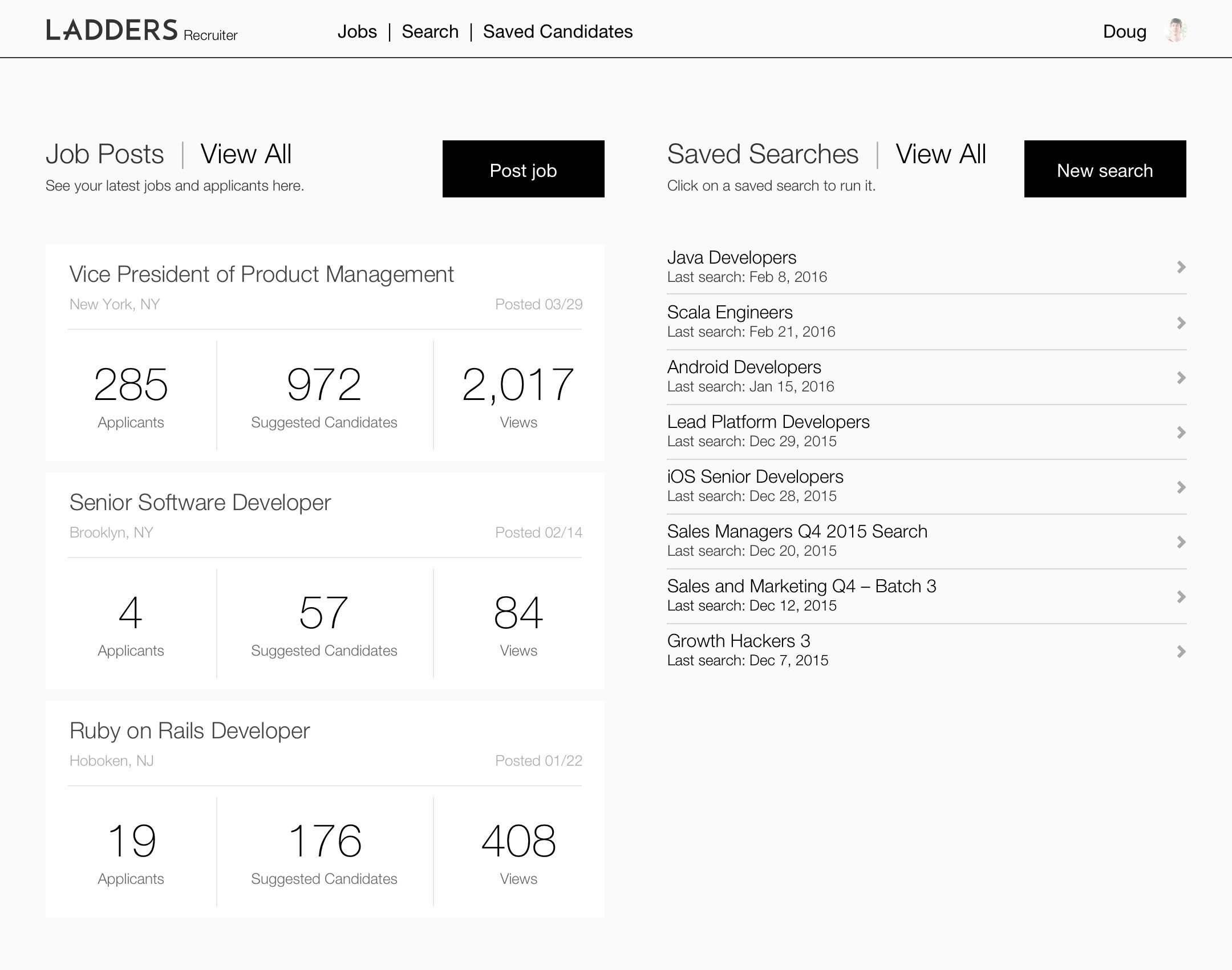 In this industry, nearly all of the revenue is driven by recruiter subscriptions and fees. Executives at Ladders realized that they would need to prioritize the Recruiter product, which had not seen any substantial development in the previous 5 years. I was part of a new team (myself, a UX researcher, product manager, and 12 developers) tasked with transforming Recruiter, eventually leading to 22% revenue growth for the company.