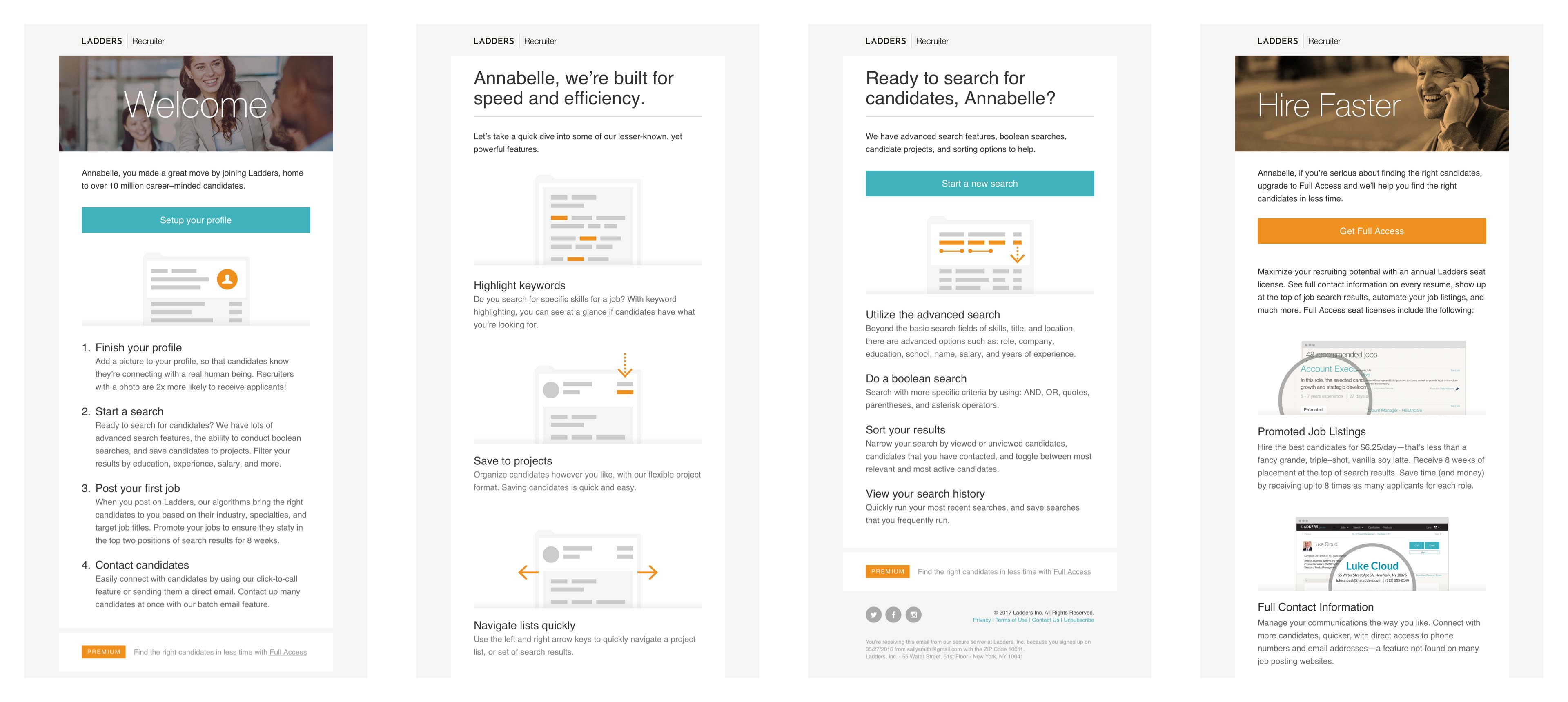 I led the effort to create a new email drip campaign, designed to onboard users and communicate the value of Full Access. I worked with marketing to spec out each email, and mapped out the logic behind all of the different paths our recruiters might take to upgrade.