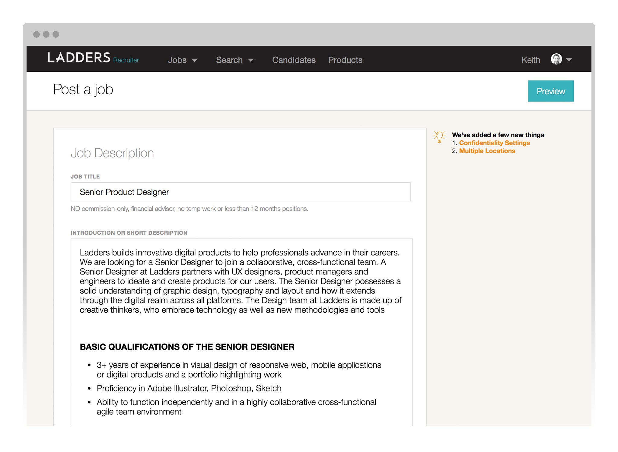 Probably the most important task for a recruiter is posting a new job—this is how they make their living. The existing page (pictured here) was functional, but had hidden fields, and didn’t map to a new data structure that our engineering team was building out. We conducted extensive prototyping and A/B testing in order to improve this page for recruiters
