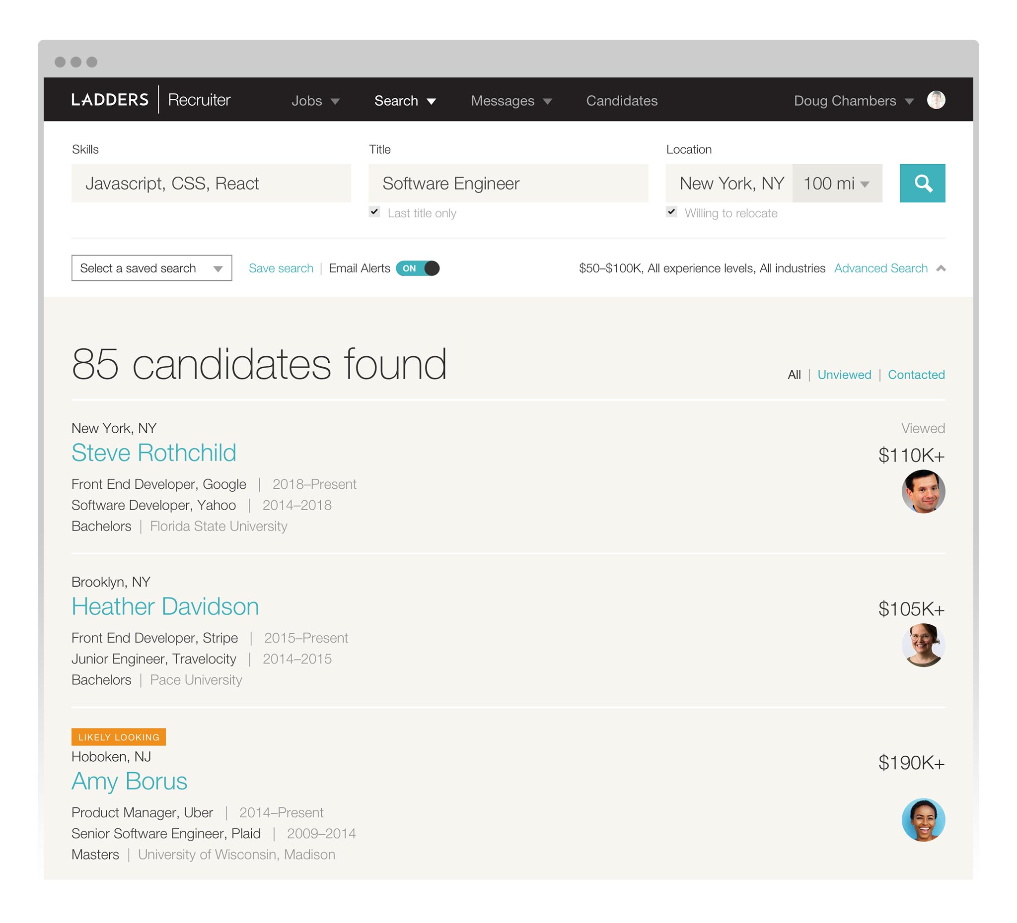 Our next task was to fix one of the core components of our platform: searching for candidates. Search results were poor and cluttered, and though we had over 8 million candidates in our system, recruiters often found themselves sourcing the same candidates for multiple roles.\u003cbr\u003eI worked in parallel with designers on the candidate team to redesign search results for both sides of the platform. The result on our end was a dramatically simplified display for recruiters, which we started A/B testing extensively.