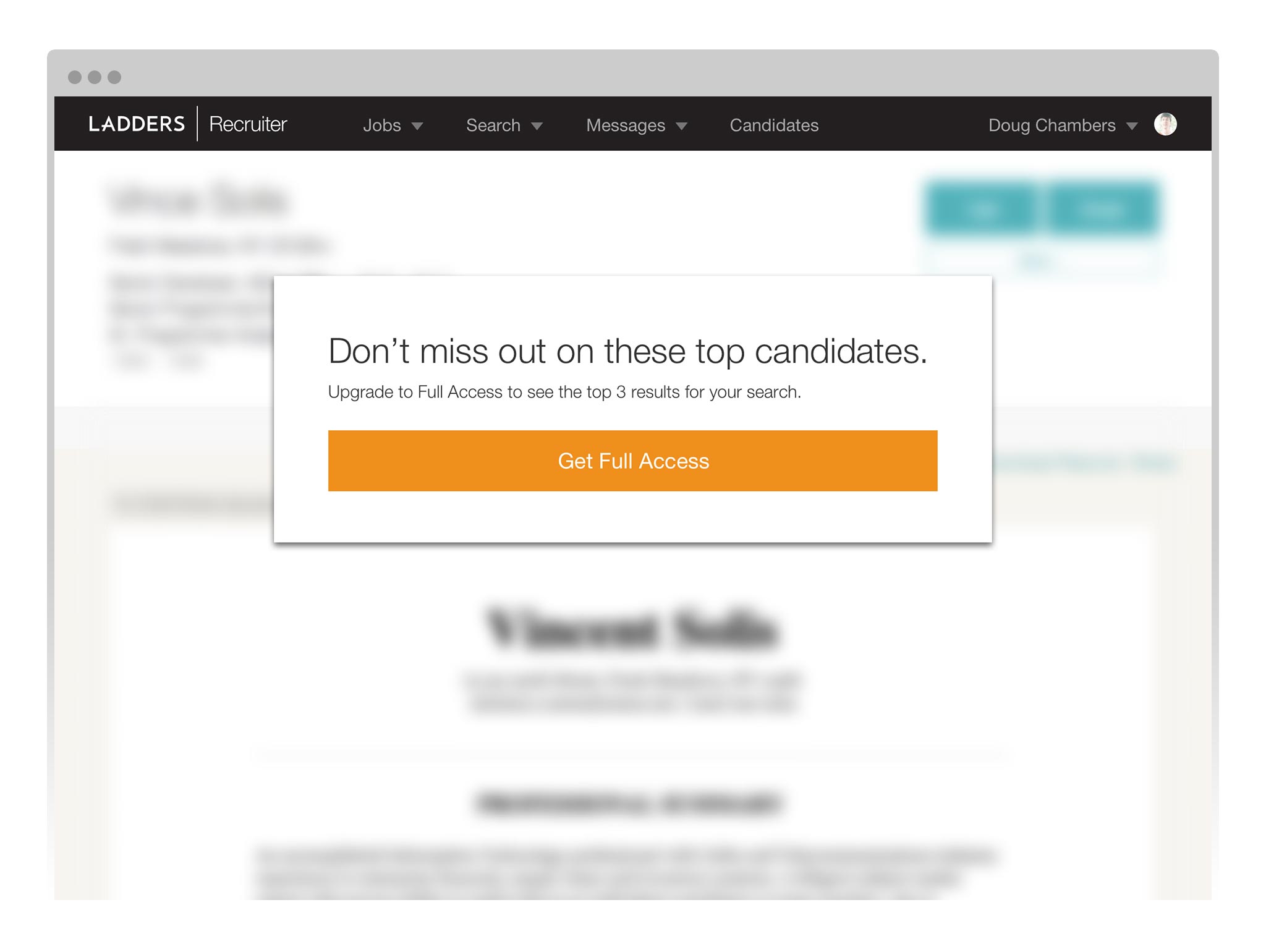 Working closely with my UX and product counterparts, we developed a plan to establish limited access to key features, in order to drive recruiters toward purchasing Full Access. We limited search results, experimenting with different ways to do so (one page limit, 3 result limit, 20 result limit per day, etc).