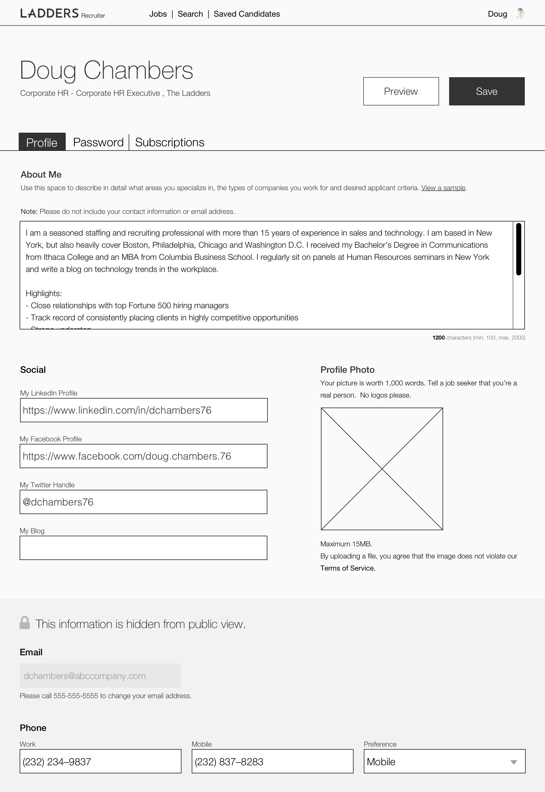 After conducting some limited user testing, we redesigned this page. Recruiter information was reorganized and consolidated into a more user–friendly interface, with formerly disparate functionality brought into the same page for ease of use. We then tested clickable prototypes with recruiters, in order to validate that this accomplished our goal of making profiles easier to update.