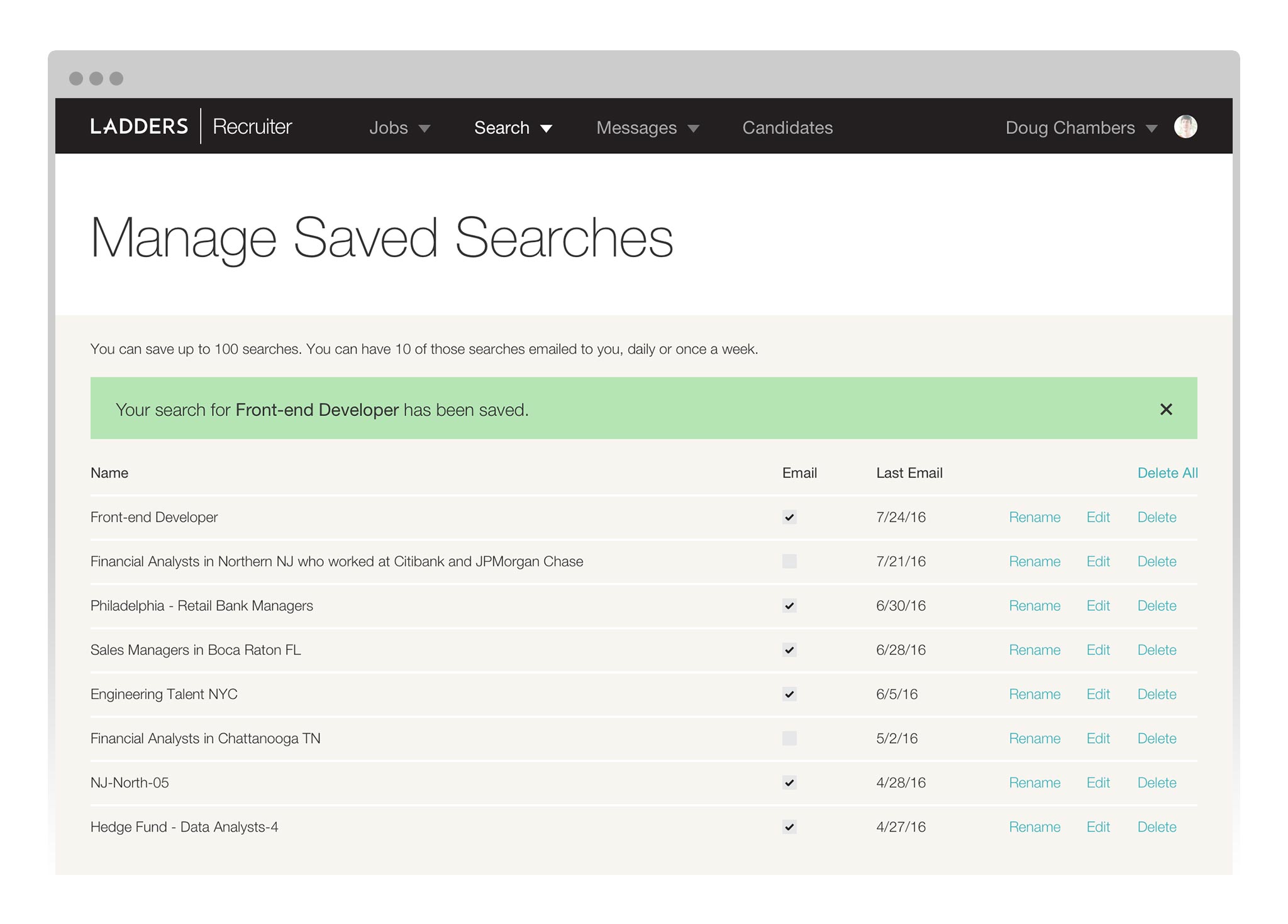 The ability to save candidate searches existed, but once a recruiter (or more likely, a sourcer) had created one, it was incredibly hard to find. Through wireframing and user testing, we determined the optimal way to surface these lists for recruiters. Revamping this feature unlocked the ability for us to monetize this feature in the future (by setting a max number of saved searches for trials or free accounts).